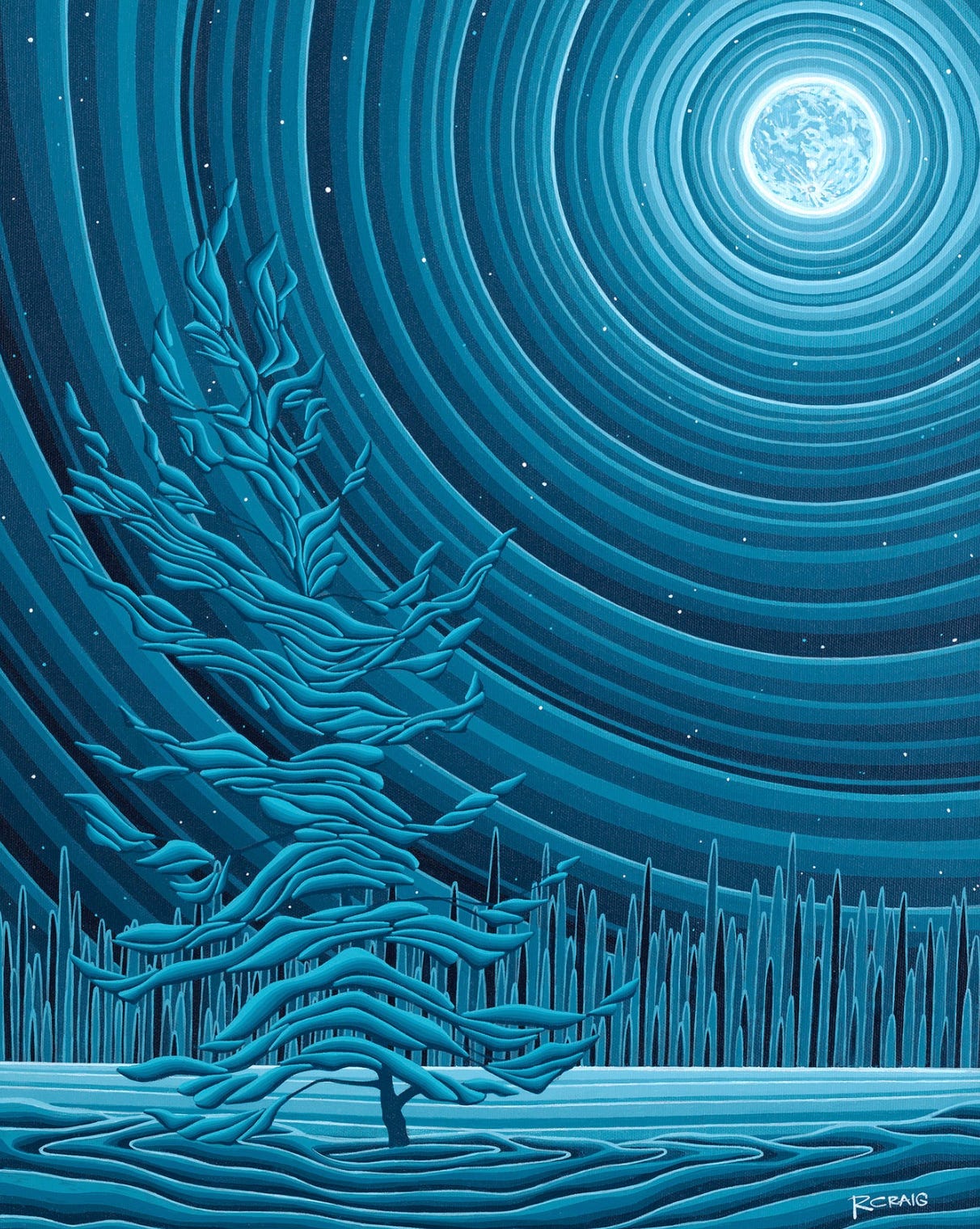 CAE 58’s featured artist is Robbie Craig, who I was first introduced to by a friend living in Canada’s Northwest Territories. Robbie grew up in Barrie, Ontario, and attended teacher’s college while painting on the side. After obtaining a job in Canada’s Northwest Territories, he says he was drawn to the rugged landscape, tundra, and crooked “Seuss-like” trees”, and knew he’d found his home. The beauty of the North inspired his paintings, too, and I find his landscapes beautiful and peaceful. The thumbnail image for CAE 59, is from his piece entitled “Night of the Jack Pines, and the image below is entitled “Beneath the Moon Glow”. I love his work, and if you do too you can find him on Instagram and on his website.